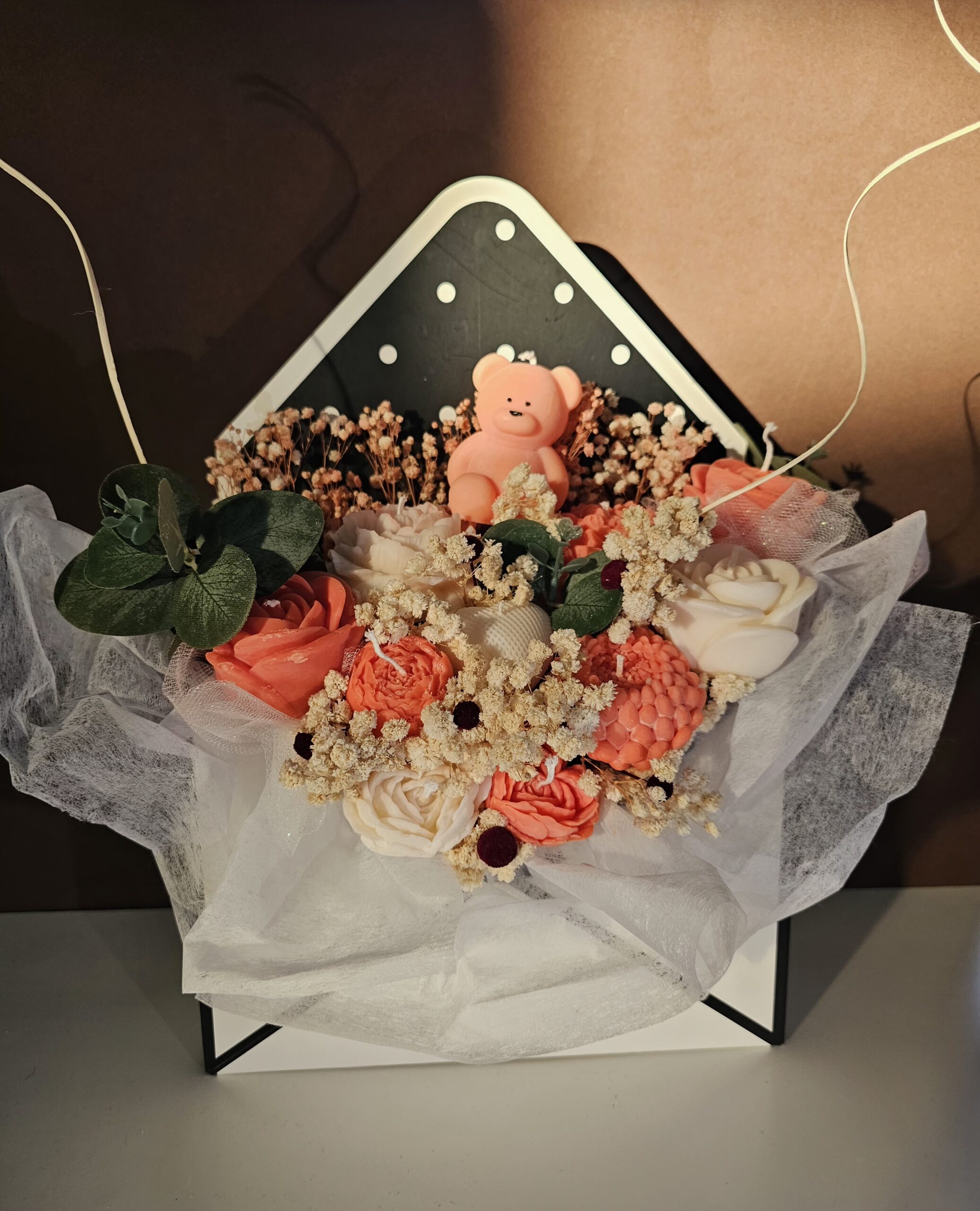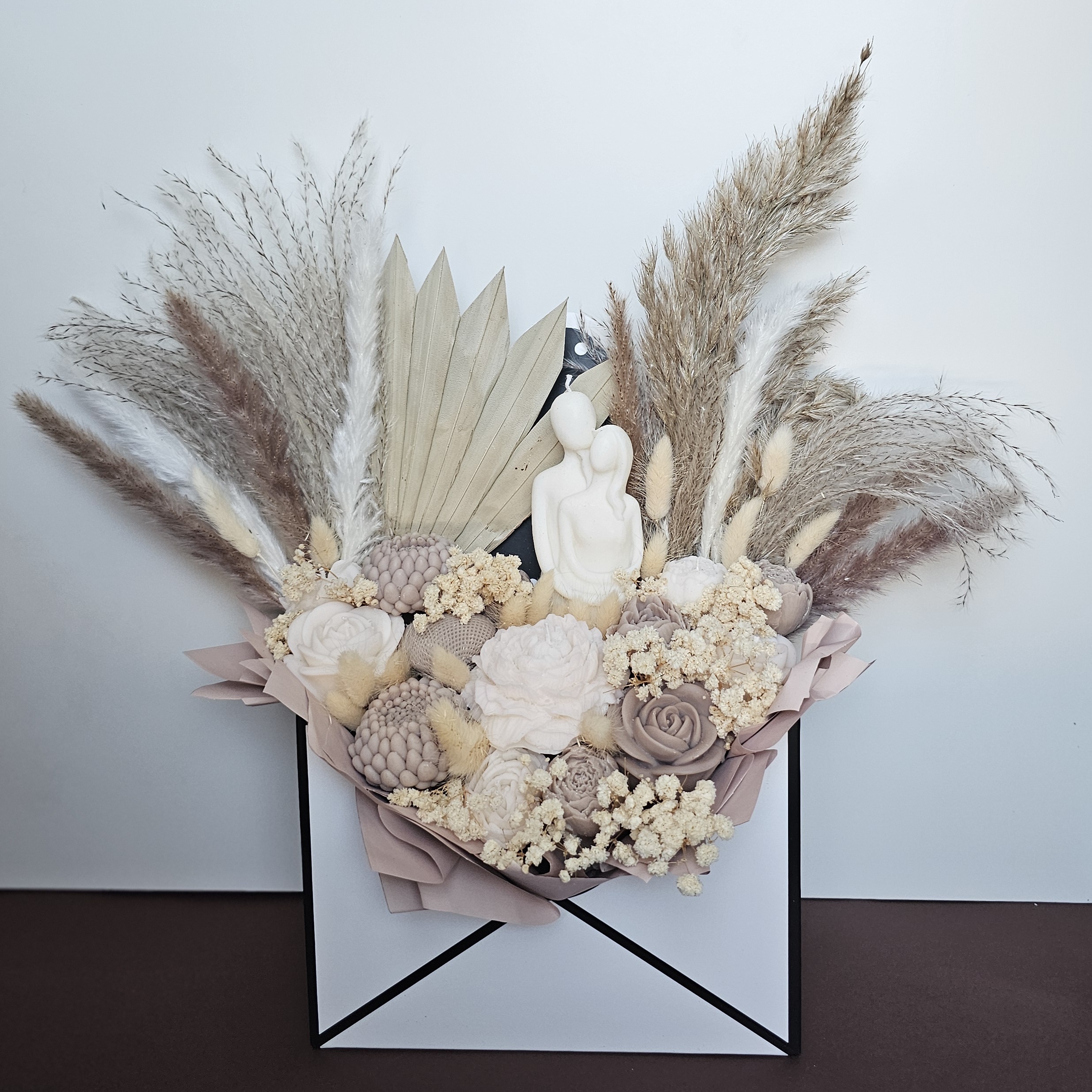 Transformă orice ocazie într-un moment special cu acest buchet unic, aranjat într-un plic elegant de 16.5 x 23 x 8 cm. Un mix delicat de flori din ceară de soia și flori naturale uscate, fiecare piesă fiind unicat, aranjată aleatoriu pentru un efect surprinzător și sofisticat. 🌿🌷