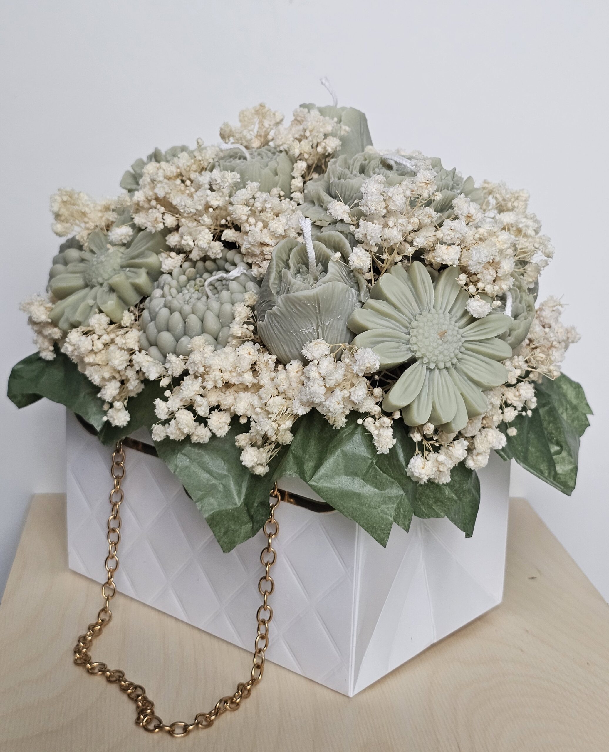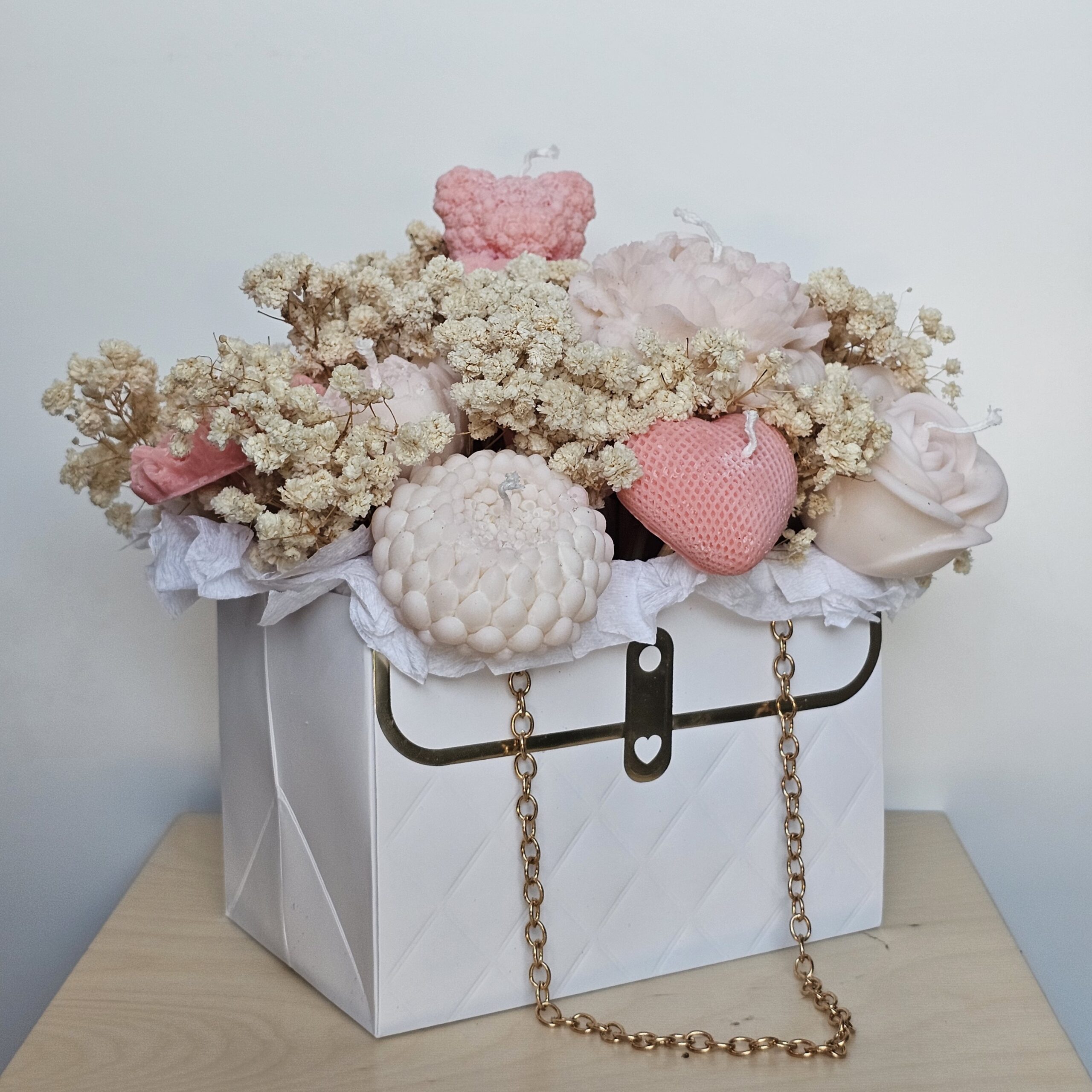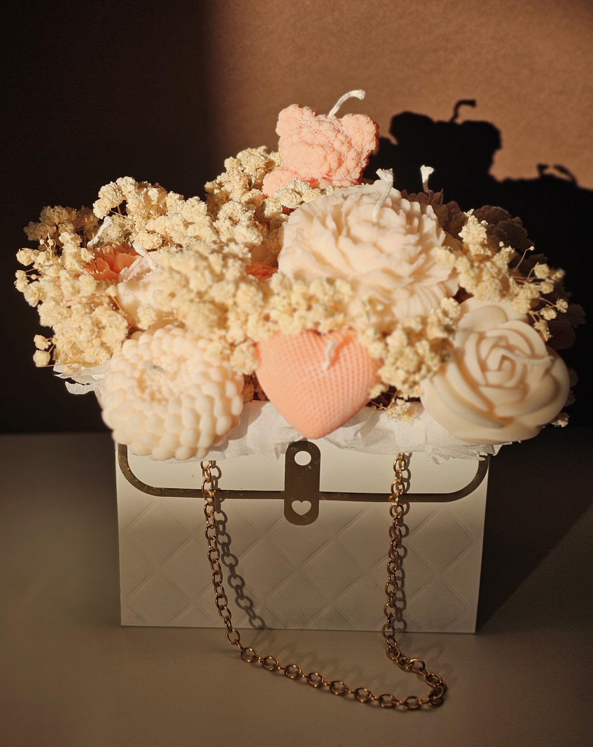 Acest buchet special este așezat într-o poșetă stilată cu lanț auriu, oferind un design sofisticat și modern. Cu dimensiunile 12 × 15 × 16 cm, este perfect atât ca decor, cât și ca un cadou de neuitat.