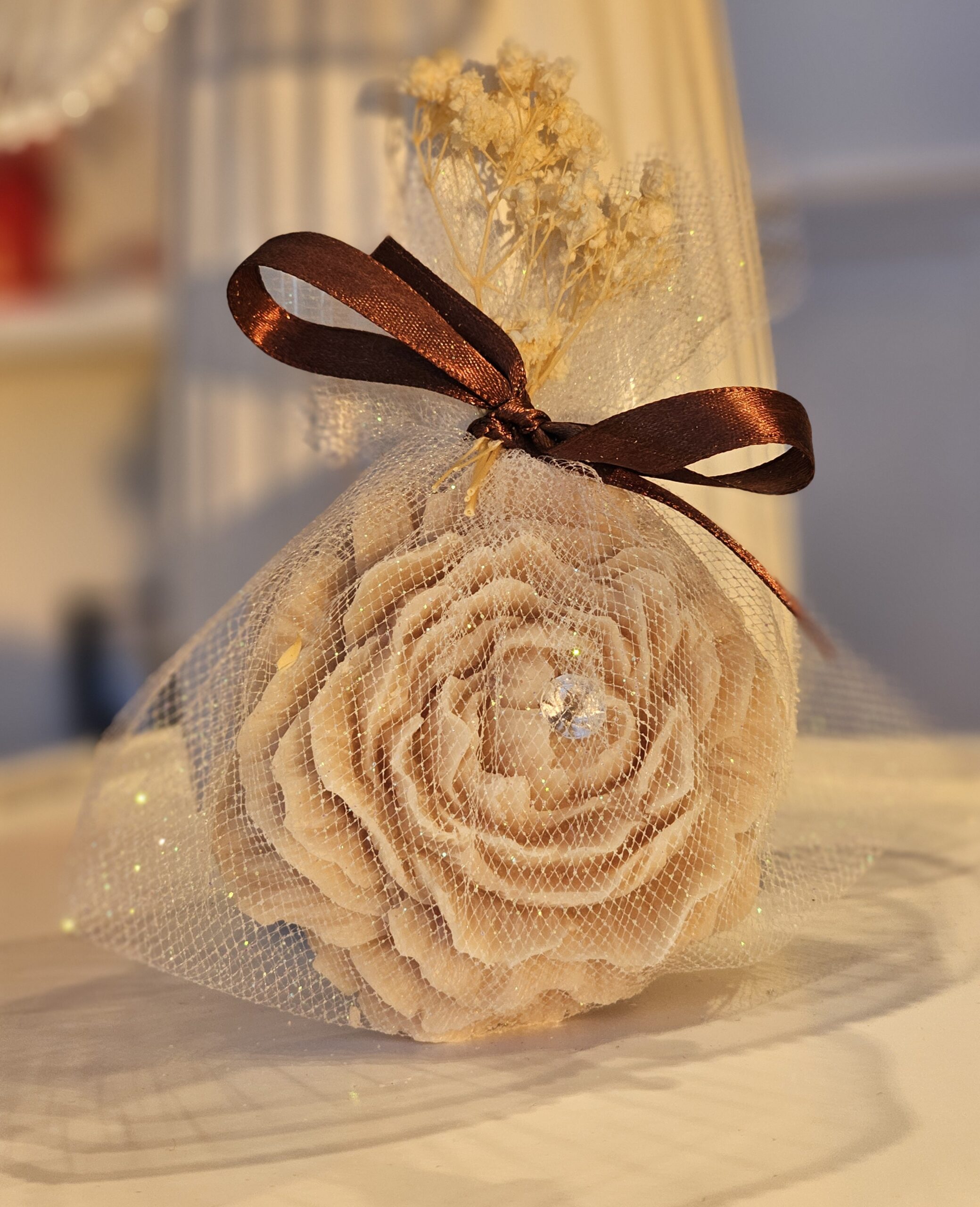 🌸 Bujor din Ceară în Tulle – Mărturie Delicată & Cadou Special 🎀