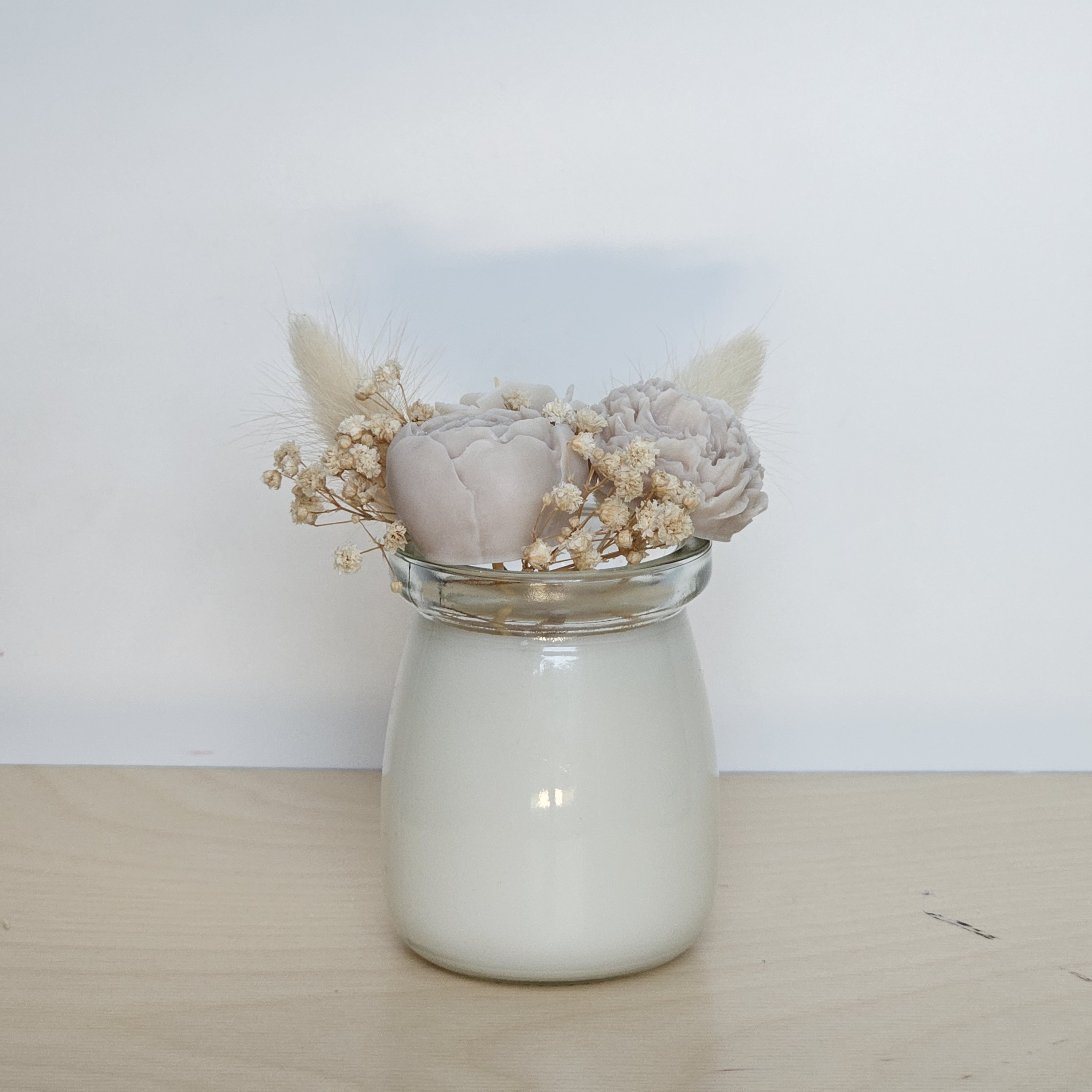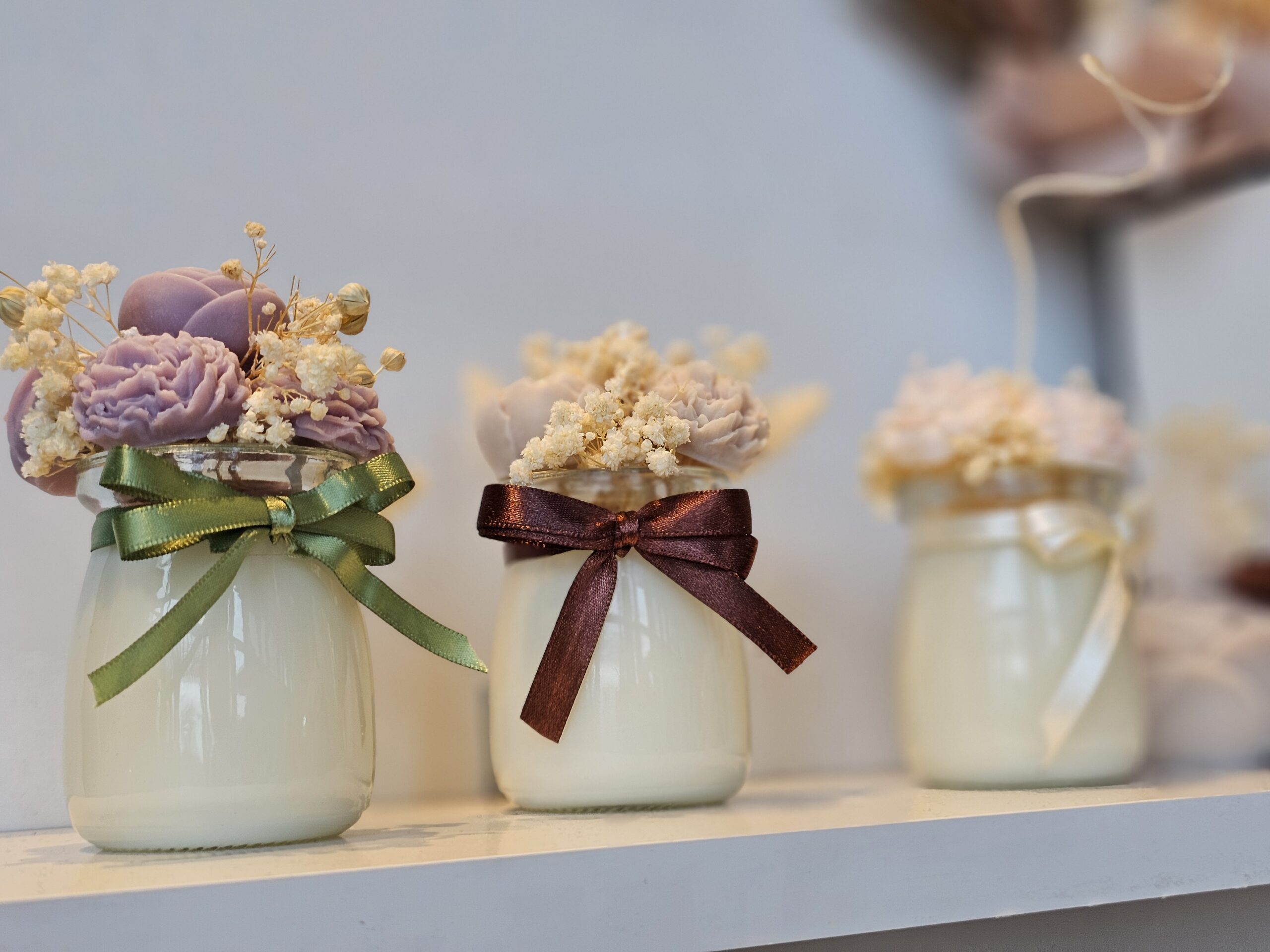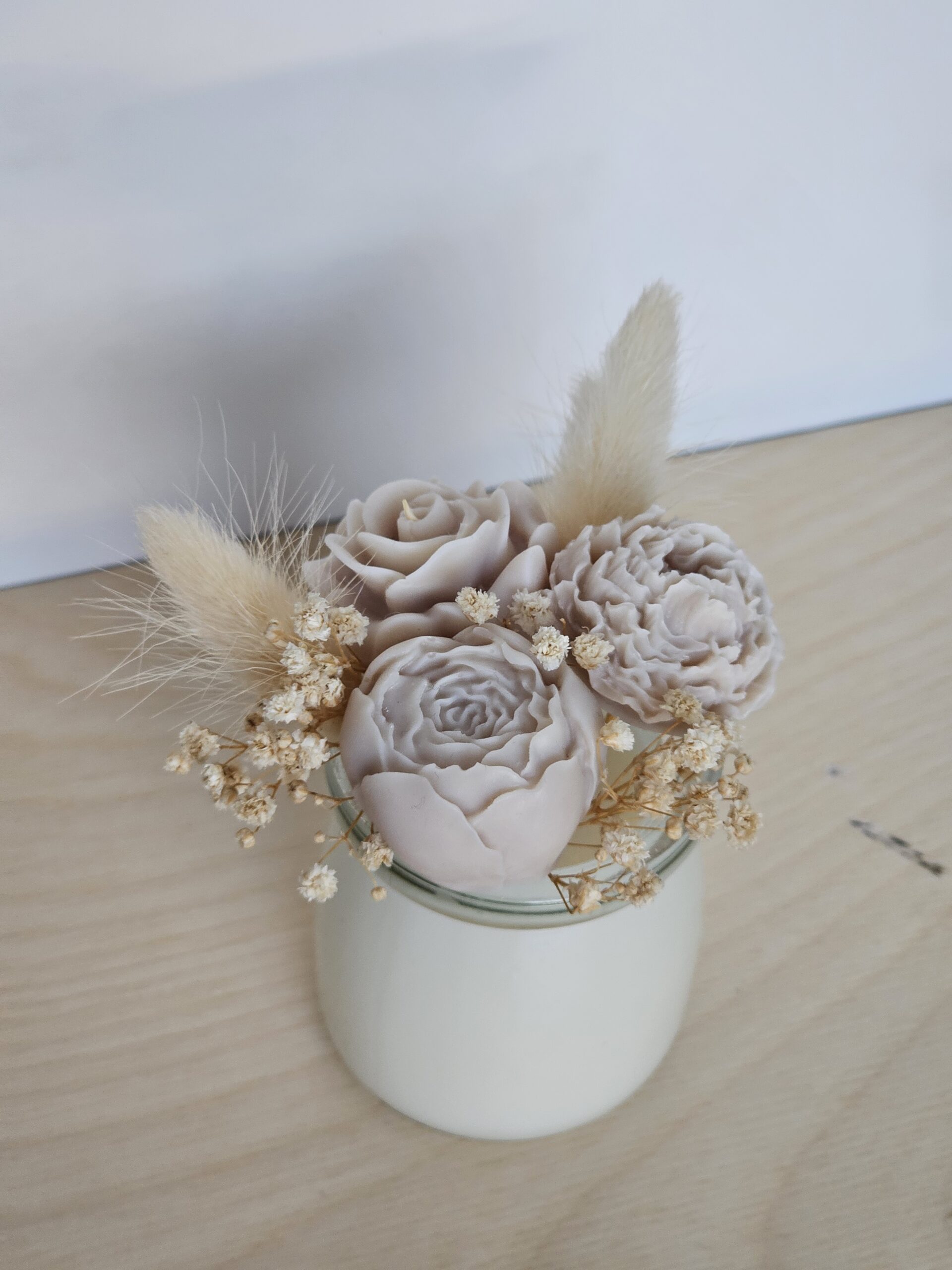 Această mărturie rafinată îmbină armonios frumusețea florilor și delicatețea lumânării din ceară de soia. Fiecare aranjament este unic, deoarece florile din ceară și cele naturale uscate sunt așezate aleatoriu, creând o compoziție surprinzătoare și specială. 🌸🌾